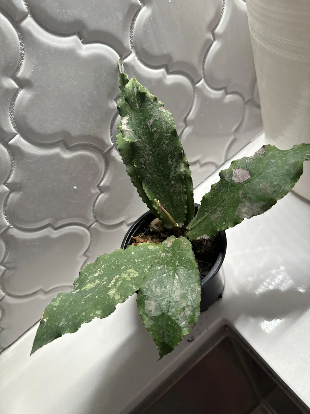 Hoya undulata is elusive and difficult to grow, but seeing its magnificent flowers is a reward unto itself. The leaves are rigid and lance shaped and range in color from olive green to deep burgundy depending on the level of light it receives. The leaves are also splashed with shimmery pink variegation. The flowers are large, star shaped, porcelain white and speckled red on the outer side of the petals.