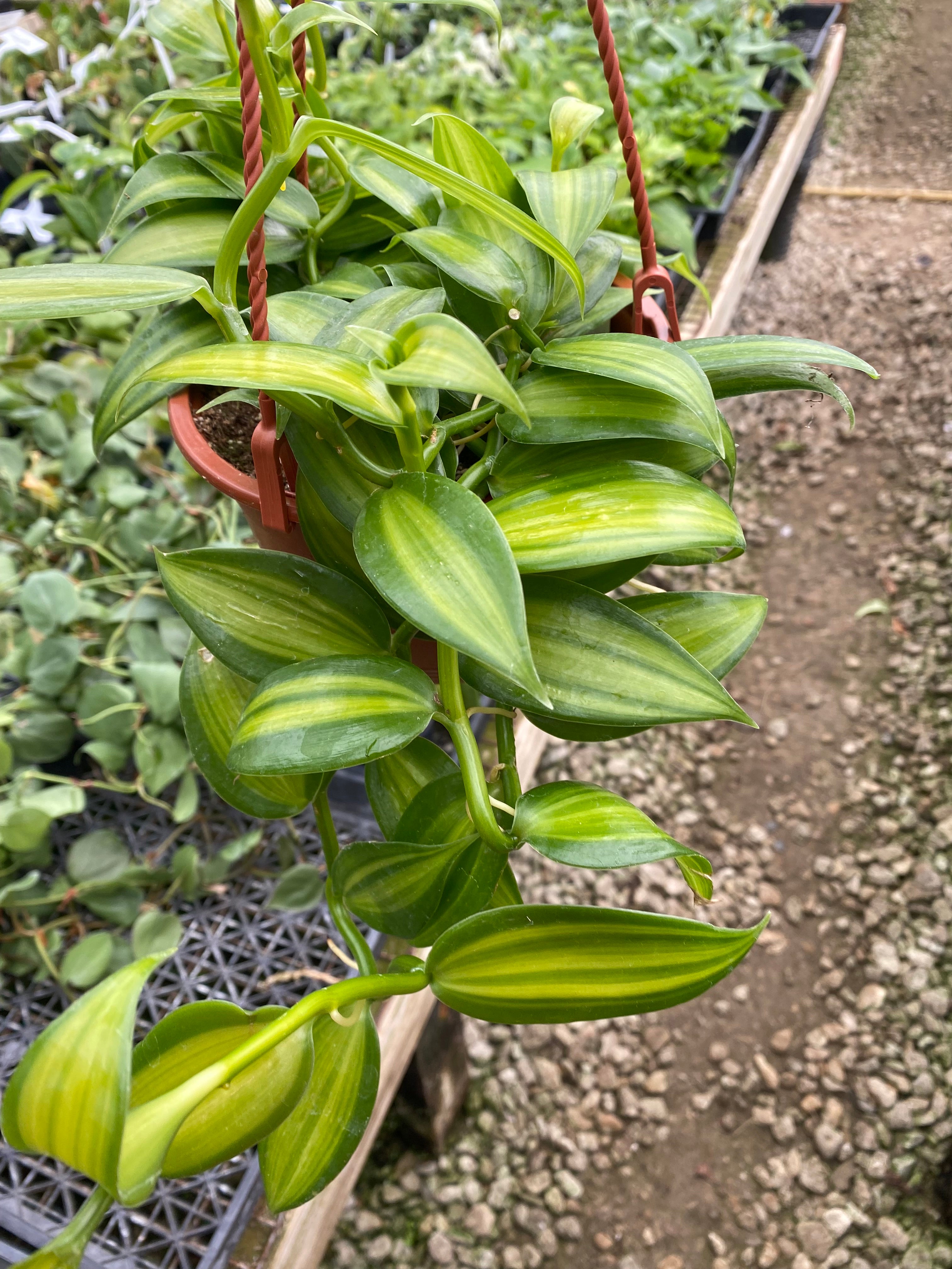 Vanilla planifolia vareigated. This is the yellow variegated variety of the Vanilla orchid of commerce. Vanilla spice comes from the cured pod of this vining orchid. The Vanilla orchid is terrestrial, and grows in a loose, well-draining, soil mix. This vine has oblong succulent leaves that are variegated with yellow stripes. The flowers are a greenish yellow and only develop on mature plants. This orchid is easy to grow if given bright light. Grow it in the average home or greenhouse as a novelty.