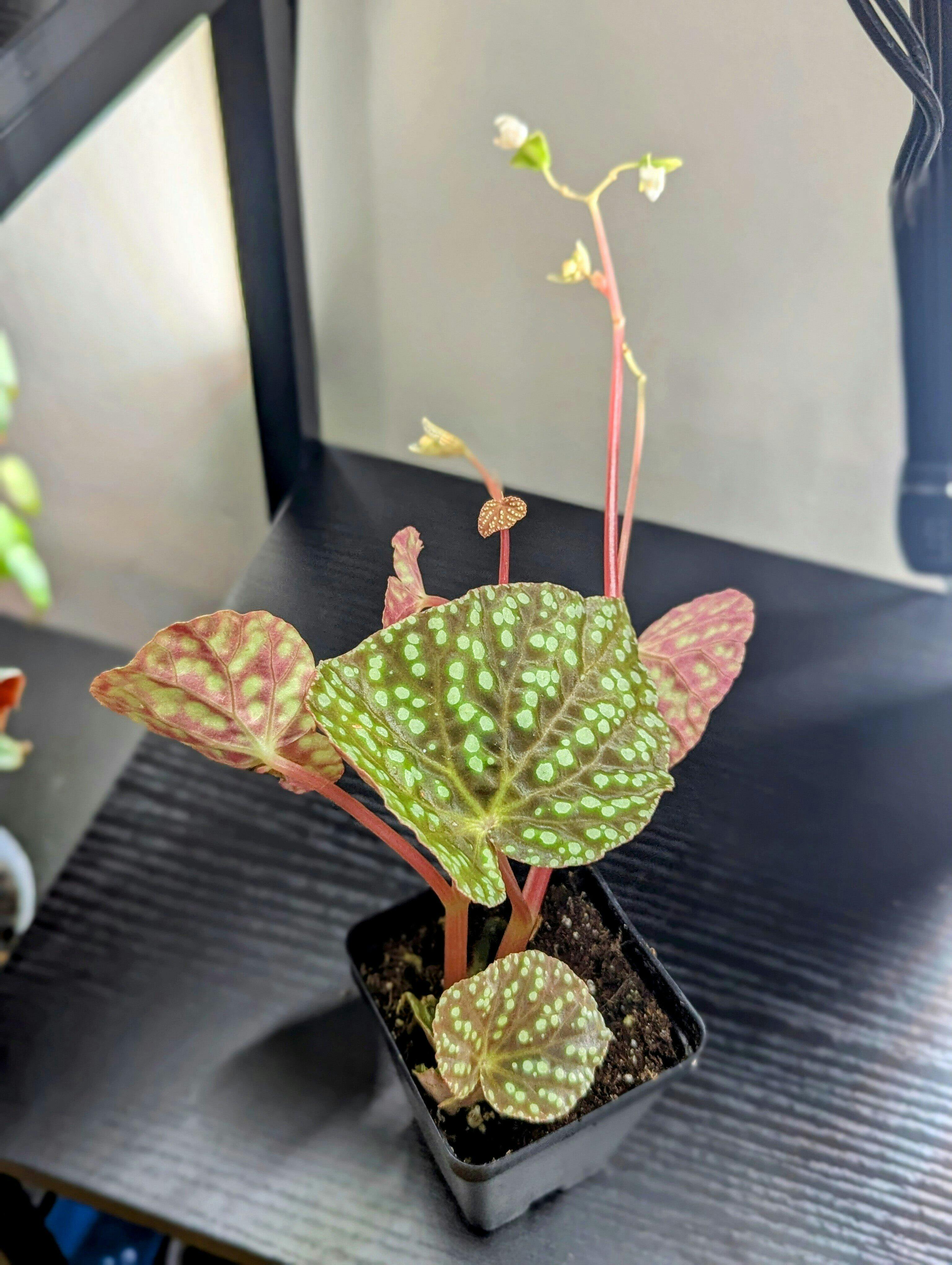 Begonia U641 is a tuberous species that requires a dormancy period in the winter months unless you pinch it back routinely. During dormancy, it may lose its leaves and be reduced to only a tuber beneath the soil. Worry not, because in spring it will grow again into a luscious specimen. Its green to reddish-brown leaves are marked with beautifully iridescent neon green dots that almost appear to glow in contrast to the leaves. This plant will need high humidity to thrive so raising in a terrarium or greenhouse is recommended.