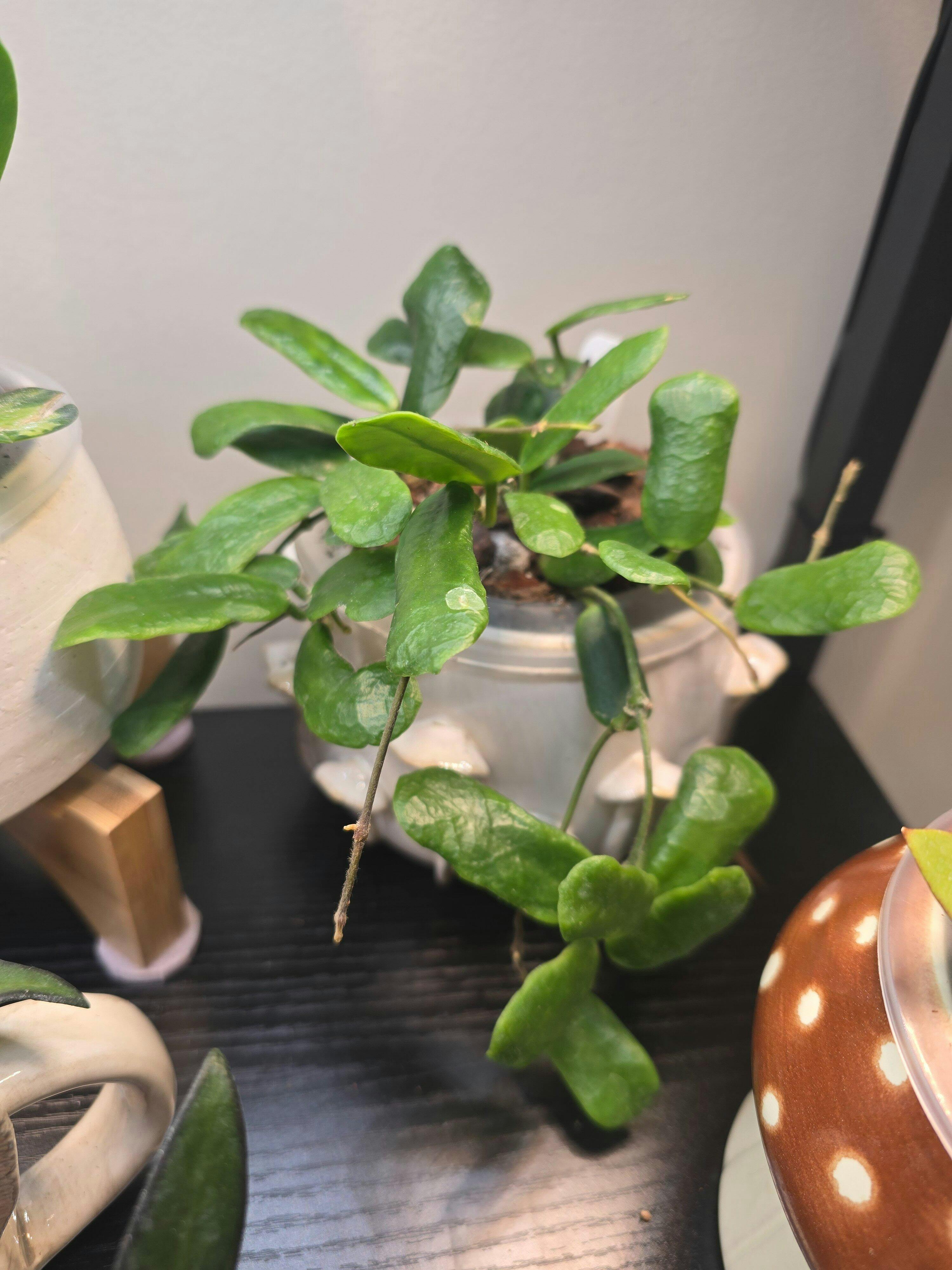 Hoya rotundiflora is a species from Thailand that has unique, almost rectangular leaves. The white flowers are small and fuzzy and smell faintly sweet.
