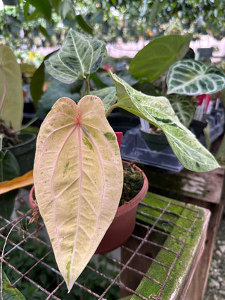 Anthurium 'Tezula Dreamweaver'/dorayaki x Variegated ('Ace of Spades'/papillilaminum)