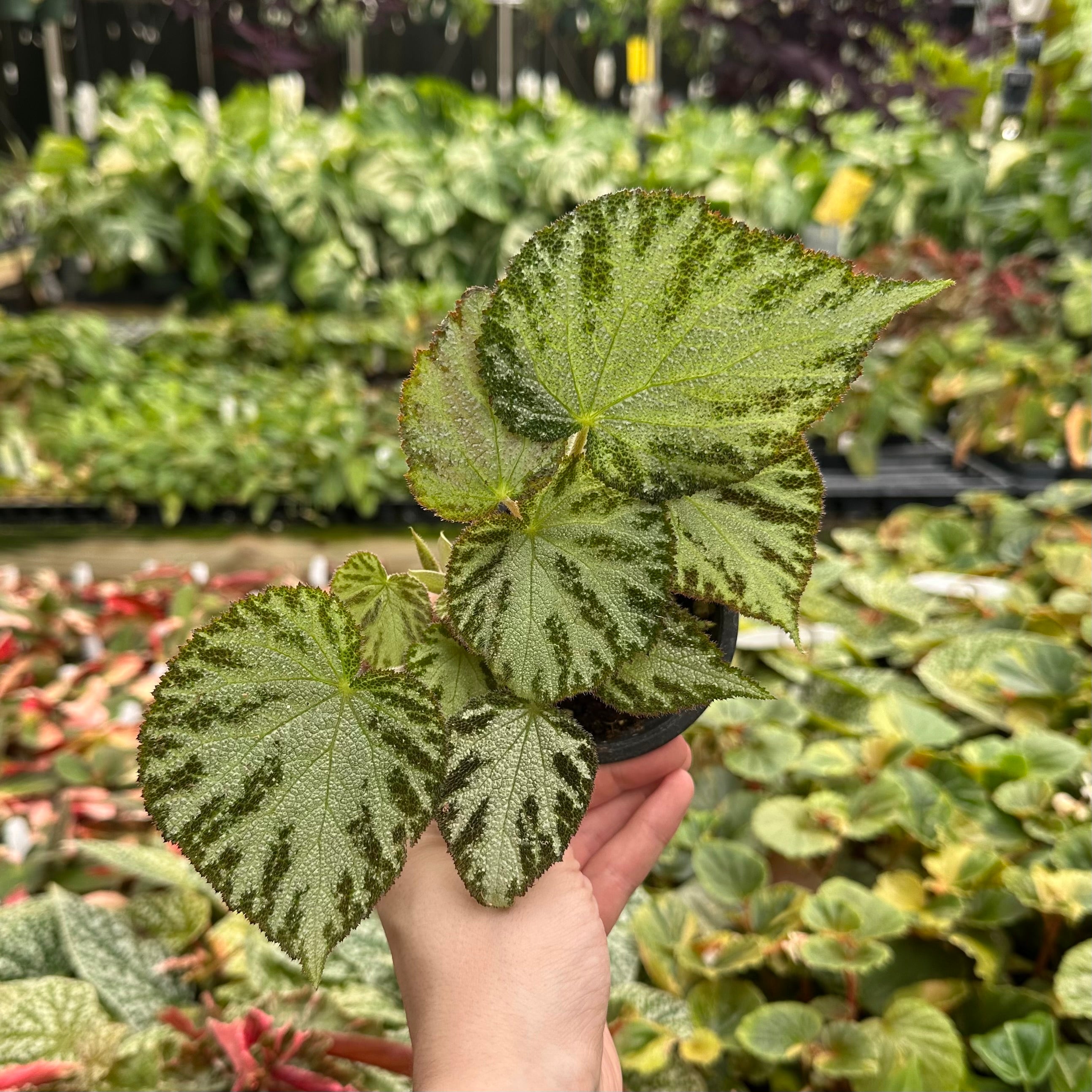 Begonia 'Silver Jewel' is a rhizomatous hybrid created by Susie Zug is 1955. It is a cross between Begonia pustulata and Begonia imperialis var. imperialis.