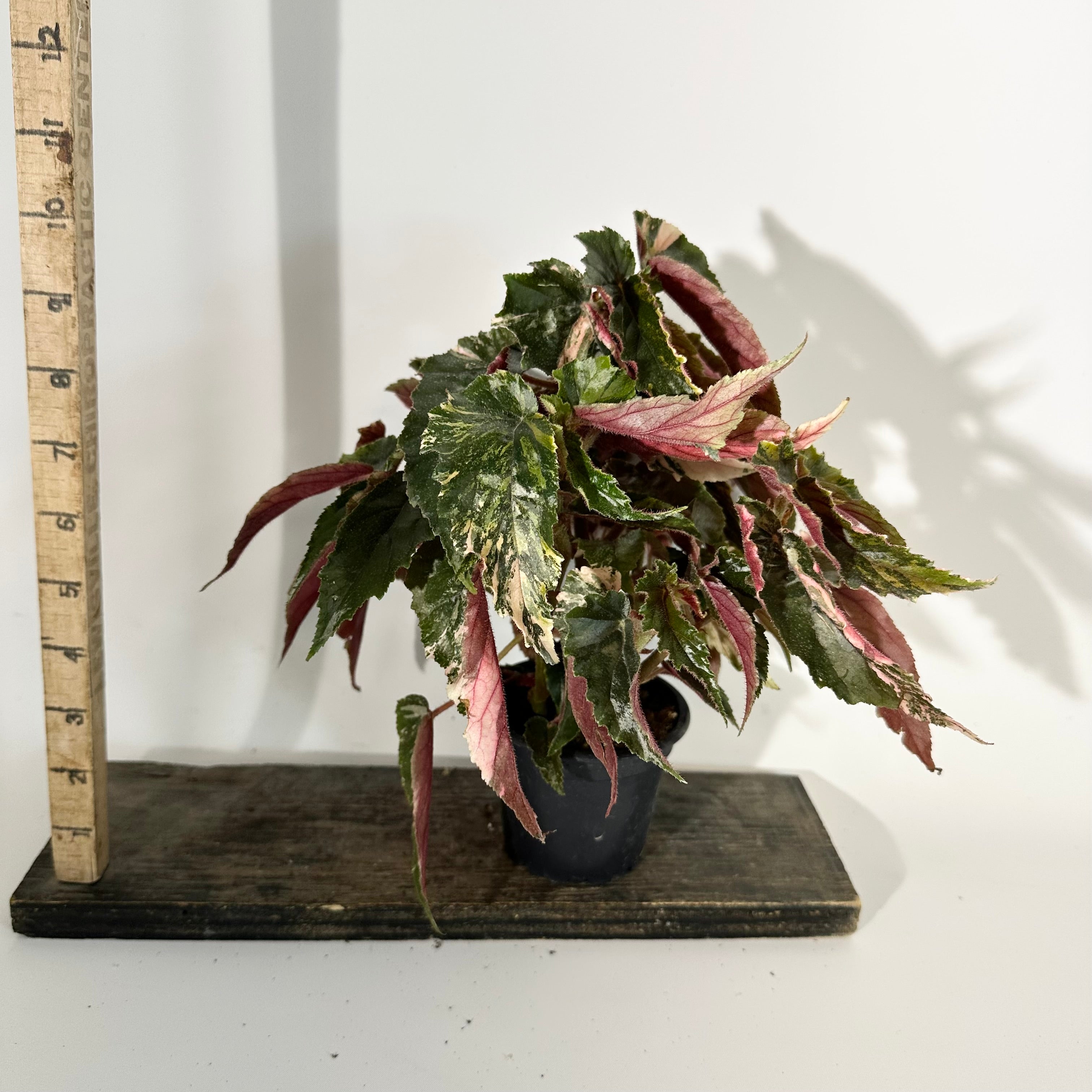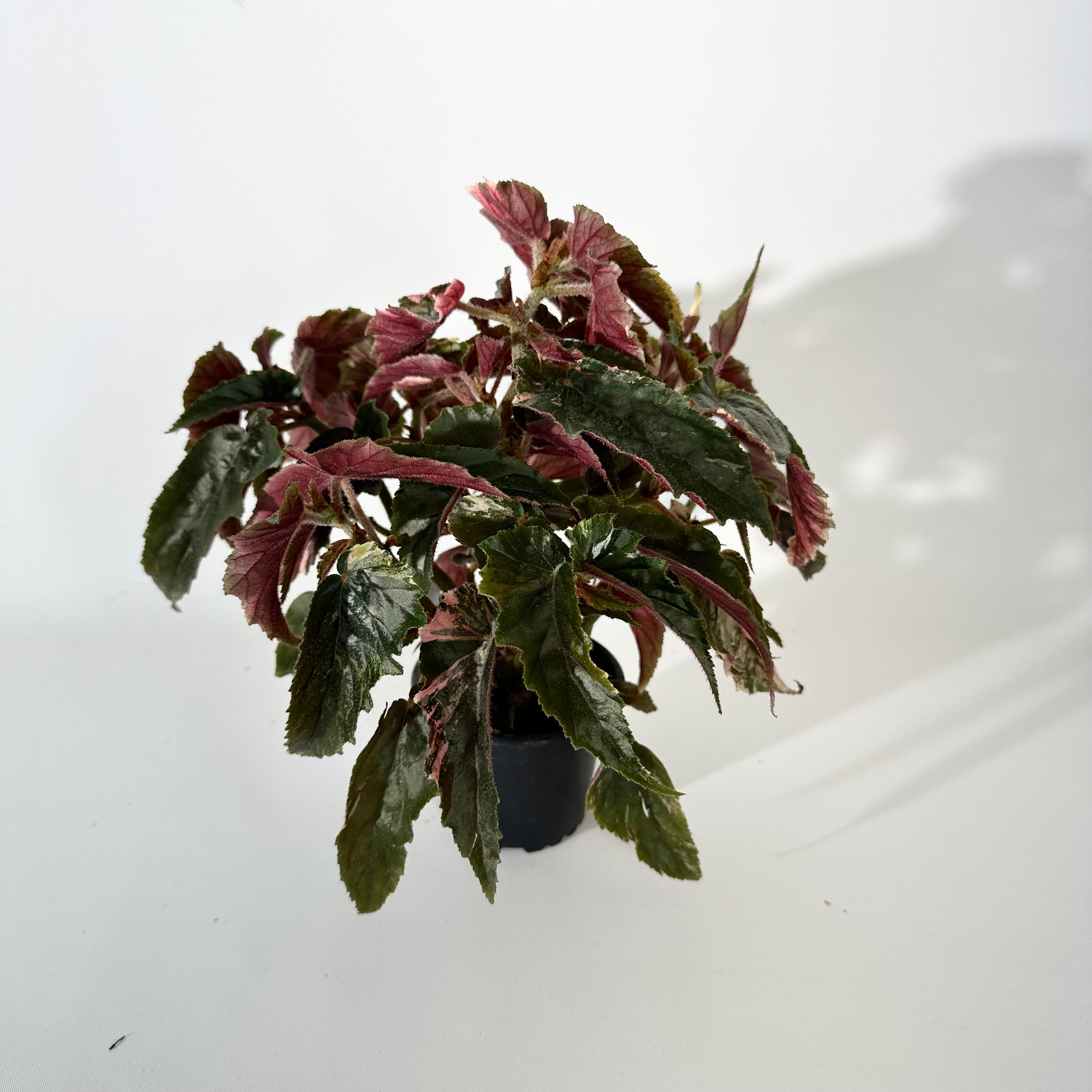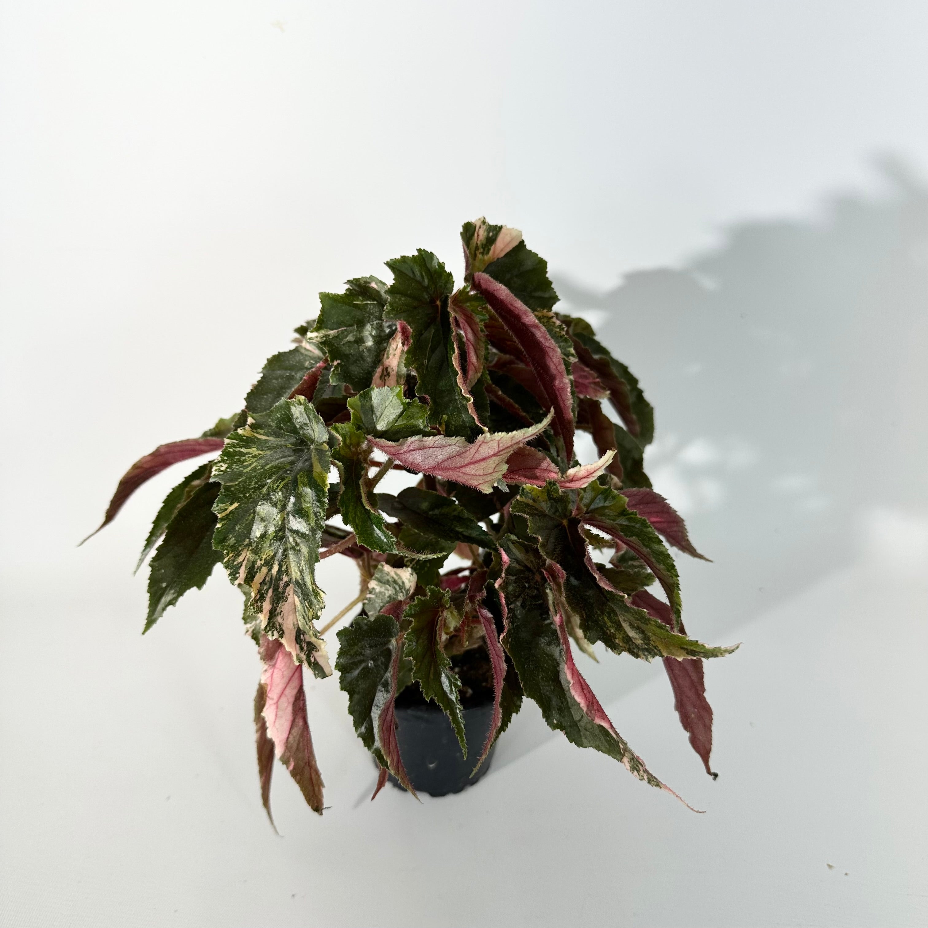 Begonia 'Ginny Galaxy' is a fantastically variegated sport of the shrub-like hybrid Begonia 'Ginny. The long, narrow leaves are mix of cream, pink and green mottling to varying degrees from leaf to leaf. It has a bushy growth habit. The flower buds are pink with striking red hairs, as the flowers open they are white and have a serrated margin. This makes a gorgeous specimen should be kept out of direct sunlight to avoid burning the delicate leaves.